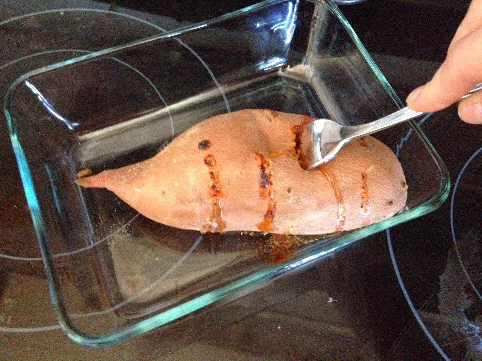 Prep and bake red sweet potato: give it a few pokes with a fork and toss it in the oven at 400 degrees for about an hour. (Remember, it will mostly likely be called a "yam" or "jewel yam" at the grocery store.)